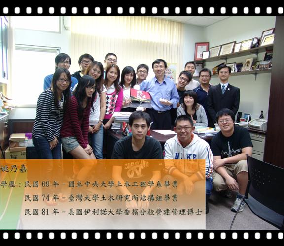 姚乃嘉老師是民國69年本校土木系畢業,服預官役時是隸屬空降特戰部隊的工兵少尉排長,役畢後回母校母系擔任助教一年。因民國72至74年在臺大結構組碩士班時主攻電腦繪圖,故畢業後曾在電腦公司工作一年。姚老師是民國74年教育部第一屆營建管理學門的公費留學生,民國75年出國攻讀營建管理博士。他說,當年本來是陪別人去考公費留考,所以也順便報名參加,但因當時國內結構人才過剩,僅有營管領域可報考。說到此姚老師笑著提到:「一切都是陰錯陽差,所以人生的際遇很難說。」由於研究所之前念的是結構,對於營管領域較陌生,因此念博士時需要較多時間去深入了解營建管理。民國81年,姚老師於美國伊利諾大學香檳校區拿到營建管理博士學位後,即回到母校擔任教職至今。